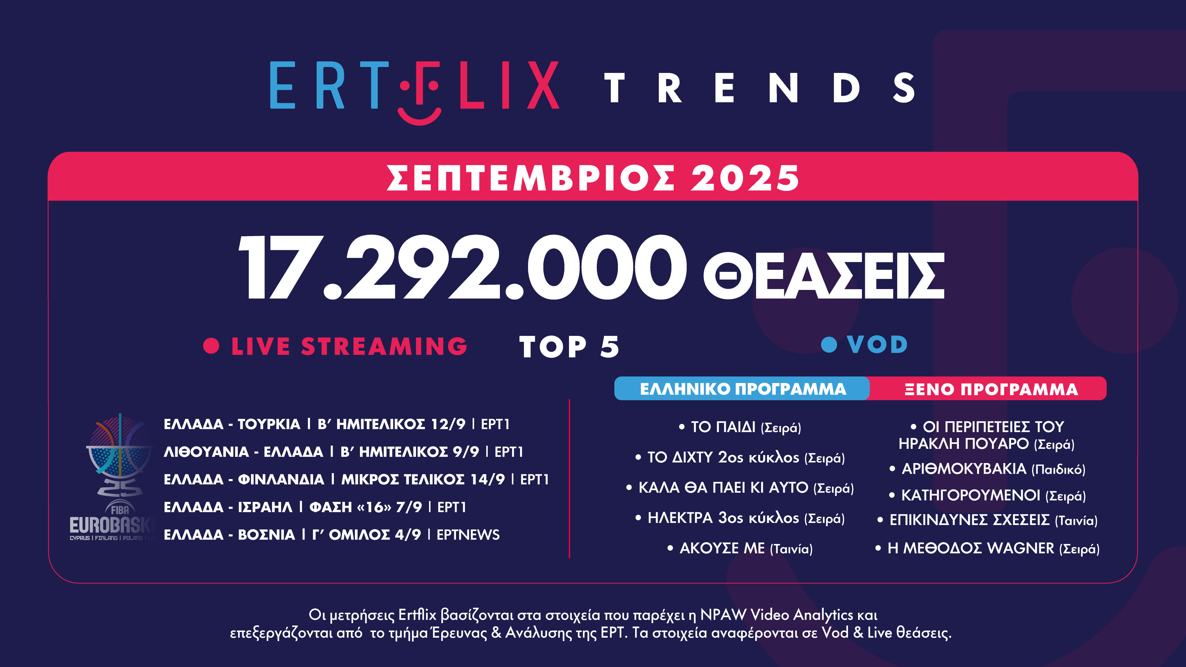 Οι κορυφαίες αναμετρήσεις της Εθνικής Ομάδας καλαθοσφαίρισης στο Ευρωμπάσκετ, οι νέες σειρές μυθοπλασίας της ΕΡΤ, καθώς και ξένες ταινίες και σειρές συγκέντρωσαν συνολικά 17.292.000 θεάσεις τον μήνα Σεπτέμβριο στο ERTFLIX.