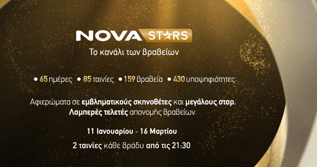 Το Novastars (θέση 200) το οποίο θα έχει ενεργοποιημένο το Catch Up 7 ημερών και θα είναι διαθέσιμο και On Demand κάτω από την ειδικά διαμορφωμένη κατηγορία, είναι εδώ και υπόσχεται ανεπανάληπτο κινηματογραφικό υπερθέαμα! Κάθε βράδυ από τις 21:30 το Novastars θα προβάλει δύο ταινίες back to back που έχουν αποσπάσει βραβεία ή έχουν διακριθεί στα σημαντικότερα φεστιβάλ κινηματογράφου, ενώ φυσικά το ενδιαφέρον μονοπωλούν και οι τελετές απονομής των βραβείων Golden Globes (11/1) και EE BAFTA Film Awards (22/2), αφιερώματα σε ηθοποιούς και σκηνοθέτες αλλά κι εβδομαδιαία αφιερώματα που μας οδηγούν με τον πιο διασκεδαστικό τρόπο στις μεγάλες τελετές.