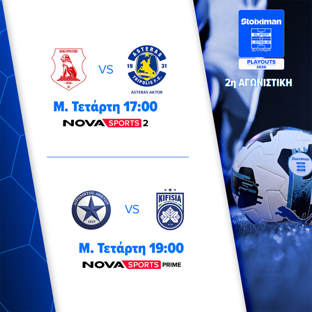 17:00 Stoiximan Super League Playouts – 2η αγωνιστική: Πανσερραϊκός–Asteras AKTOR Novasports2 σε περιγραφή του Γιάννη Πάγκου και ρεπορτάζ των Ευγένιου Δαδαλιάρακαι Άκη Κουζούλη